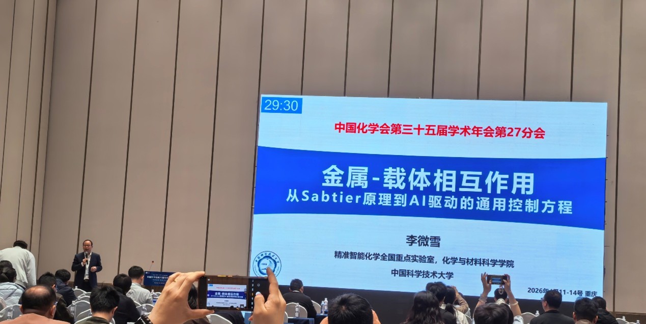 在报告环节,李微雪教授受邀作了题为《金属-载体作用:从Sabatier原理到AI驱动的控制方程》的学术报告。报告系统梳理了金属-载体相互作用的理论发展脉络,从经典Sabatier原理出发,深入探讨了载体对金属活性中心电子结构、几何构型及催化反应动力学的调控机制。